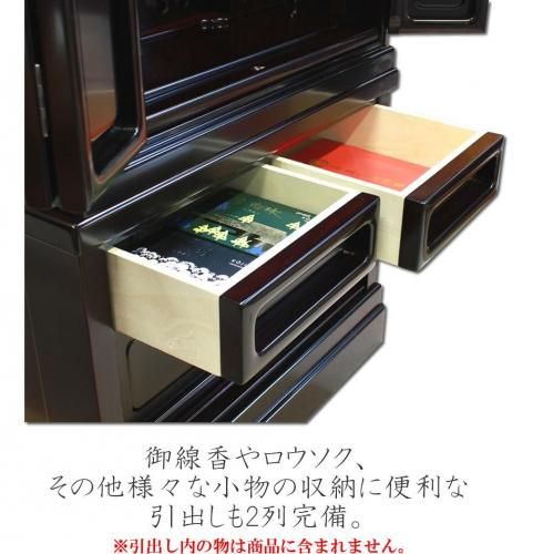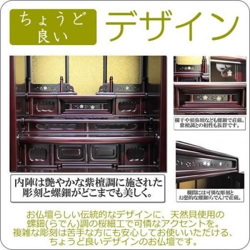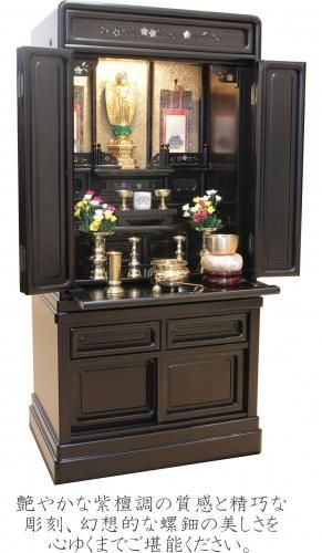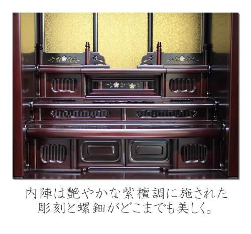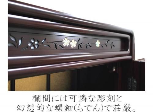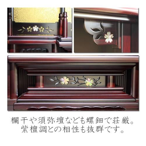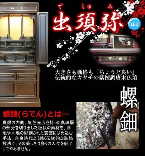 【伝統的な装飾技法・螺鈿(らでん)を施した艶やかな紫檀調唐木仏壇】螺鈿とは、貝殻の内側、虹色光沢を持った真珠層の部分を切り出した板状の素材を漆地や木地の彫刻された表面にはめ込む手法。奈良時代より続く伝統的な装飾技法で、その美しさは多くの人々を魅了してやみません。この出須弥には彫刻に加えてその螺鈿装飾を施した大変華やかな仕上がりです。幻想的な表情を心行くまでお楽しみください。