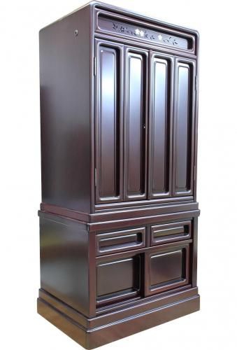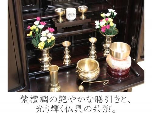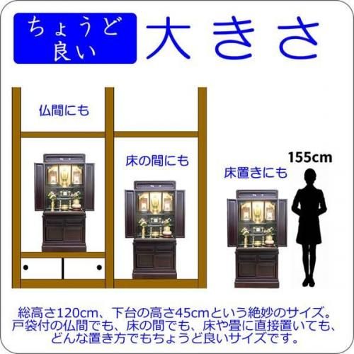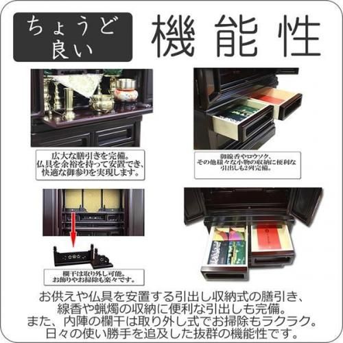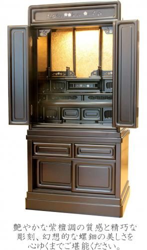 【大きさもスタイルも「ちょうどいい」紫檀調唐木仏壇】一般的な仏間に飾るのにも、床の間などに直接安置するのにもピッタリの大きさ、須弥壇部分は十分なスペースを確保して余裕を持ったお飾りが可能なデザイン、天然木ならではの質感と紫檀調の艶やかさ。あらゆる面で、多くの方にとって「ちょうどいい」。皆様が探されているお仏壇は、まさにこんなお仏壇ではないでしょうか。