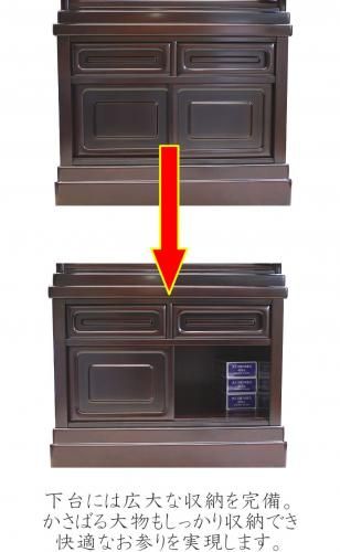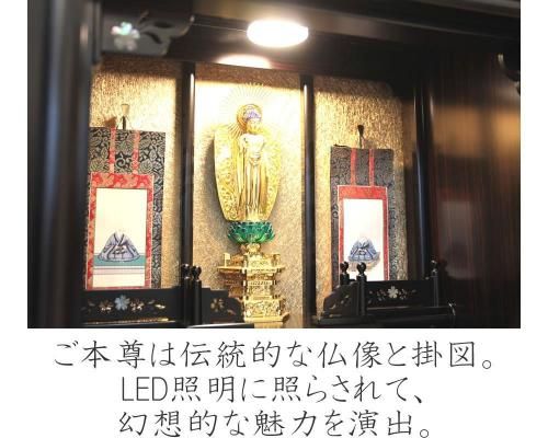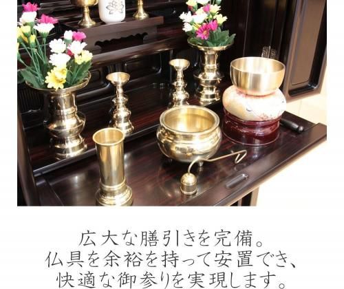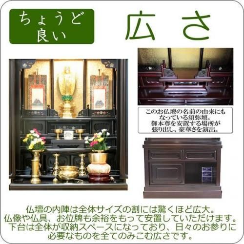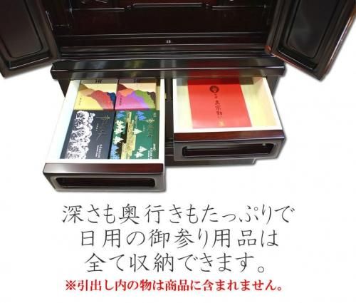 【ご本尊をゆったり安置。豪華須弥壇を完備。】クラスを超えた豪華な須弥壇を完備。ぐっと張り出した須弥壇がご本尊の安置場所に余裕を与え、すっきり快適なおまいりを実現しました。