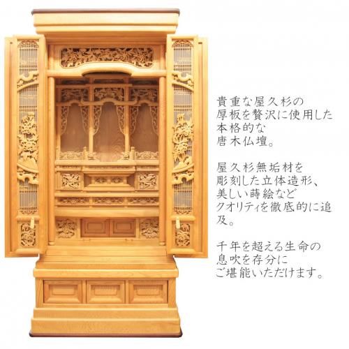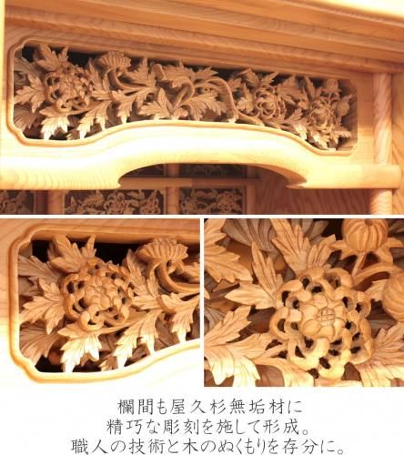 屋久杉の無垢材を贅沢に繊細に。お仏壇のいたるところに施された彫刻はまさに伝統美。職人の業の結晶です。