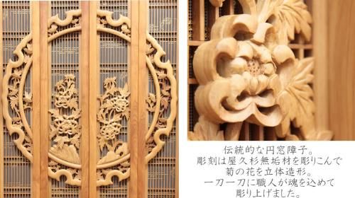 障子扉は伝統的な円窓障子。円窓は鎌倉時代に宋から伝わった寺院建築様式です。屋久杉無垢材に職人が丁寧に彫刻を施し、美しく幻想的な円窓を再現しました。