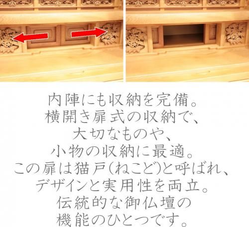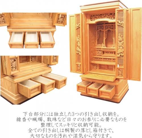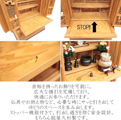 多数の収納や棚板など、使いやすさにこだわりました。多機能なお仏壇が快適なお参りを実現します。