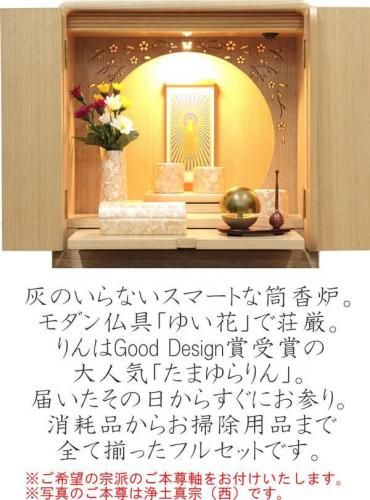 お仏壇を買うときに困るのが仏具。何が必要かわからない、大きさが合うかどうか不安、、、、さまざまな疑問や不安を感じることも多いはず。そこで、お飾りに必要な仏具を全てセットしてお届け。届いたその日からお参りいただくことができます。知識豊富な専門家がお仏壇にピッタリの仏具をコーディネート。仏具は可憐でモダンな仏具「ゆい花」をセット。陶器に華やかな花柄デザイン、シャンパンゴールドのカラーリングでお仏壇の雰囲気がガラリと変わります。灰のいらない筒型香炉でスタイリッシュに、エコにお参りいただけます。おりんはGood Design賞受賞のモダンりん「たまゆらりん」。コロンと丸い可愛いフォルム、たたくとゆらゆらと揺れながら美しい音を奏でる姿に癒されること間違い無しの大人気おりんです。