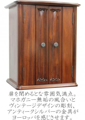 アンティーク家具にピッタリの高級マホガニー製のおしゃれなミニ仏壇。LEDライト付きで優しい灯りを演出。コンパクトサイズで現代の暮らしにぴったり。繊細な彫刻と温かみのある木目も魅力です。ヴィンテージの風合いを再現しておりますので、色むらなどを気にされる方は慎重にご検討くださいませ。