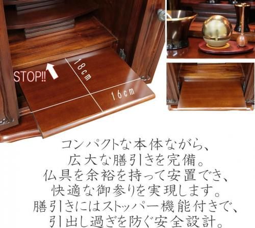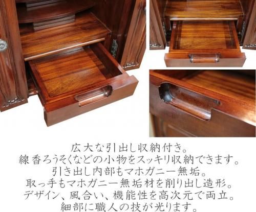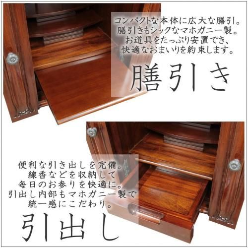コンパクトな本体に広大な膳引。膳引きもシックなマホガニー製。お道具をたっぷり安置でき、快適なおまいりを約束します。便利な引き出しも完備。線香などを収納して毎日のお参りを快適に。引出し内部もマホガニー製で統一感にこだわり。
