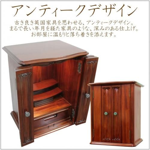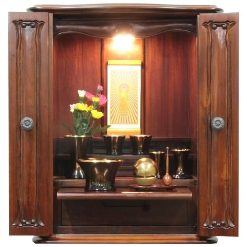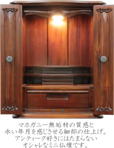 アンティーク家具にピッタリの高級マホガニー製のおしゃれなミニ仏壇。LEDライト付きで優しい灯りを演出。コンパクトサイズで現代の暮らしにぴったり。繊細な彫刻と温かみのある木目も魅力です。ヴィンテージの風合いを再現しておりますので、色むらなどを気にされる方は慎重にご検討くださいませ。