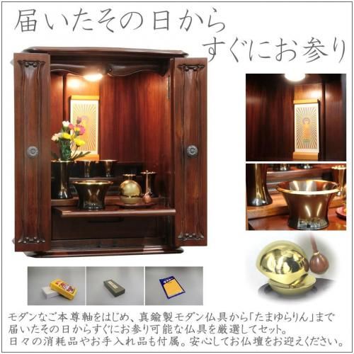 お仏壇を買うときに困るのが仏具。何が必要かわからない、大きさが合うかどうか不安、、、、さまざまな疑問や不安を感じることも多いはず。そこで、お飾りに必要な仏具を全てセットしてお届け。届いたその日からお参りいただくことができます。知識豊富な専門家がお仏壇にピッタリの仏具をコーディネート。仏具は高岡製の高級六具足。ブラウンの艶やかな輝きは高級感に溢れています。おりんはGood Design賞受賞のモダンりん「たまゆらりん」。コロンと丸い可愛いフォルム、たたくとゆらゆらと揺れながら美しい音を奏でる姿に癒されること間違い無しの大人気おりんです。