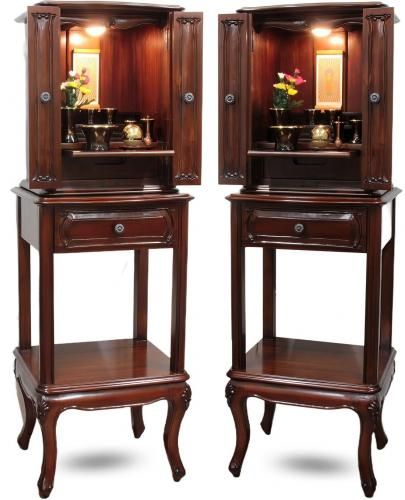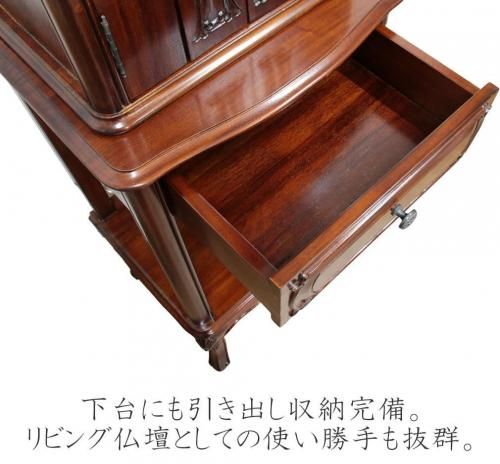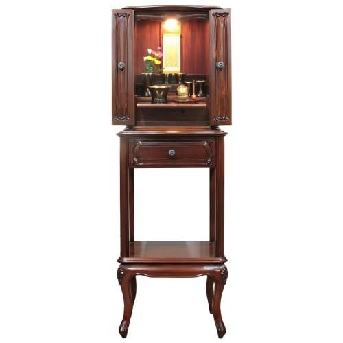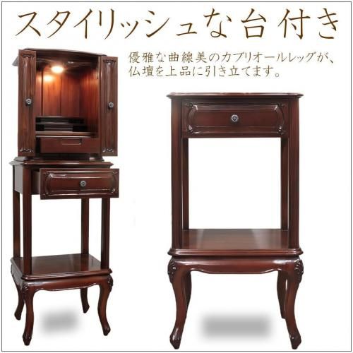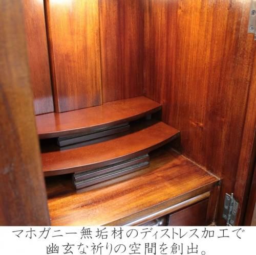 アンティーク家具にピッタリの高級マホガニー製のおしゃれな台付仏壇。LEDライト付きで優しい灯りを演出。コンパクトサイズで現代の暮らしにぴったり。繊細な彫刻と温かみのある木目も魅力です。ヴィンテージの風合いを再現しておりますので、色むらなどを気にされる方は慎重にご検討くださいませ。