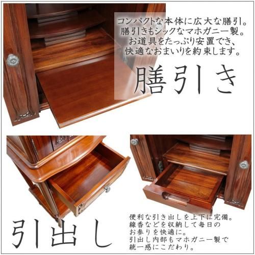 コンパクトな本体に広大な膳引。膳引きもシックなマホガニー製。お道具をたっぷり安置でき、快適なおまいりを約束します。便利な引き出しも完備。線香などを収納して毎日のお参りを快適に。引出し内部もマホガニー製で統一感にこだわり。