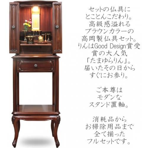 お仏壇を買うときに困るのが仏具。何が必要かわからない、大きさが合うかどうか不安、、、、さまざまな疑問や不安を感じることも多いはず。そこで、お飾りに必要な仏具を全てセットしてお届け。届いたその日からお参りいただくことができます。知識豊富な専門家がお仏壇にピッタリの仏具をコーディネート。仏具は高岡製の高級六具足。ブラウンの艶やかな輝きは高級感に溢れています。おりんはGood Design賞受賞のモダンりん「たまゆらりん」。コロンと丸い可愛いフォルム、たたくとゆらゆらと揺れながら美しい音を奏でる姿に癒されること間違い無しの大人気おりんです。