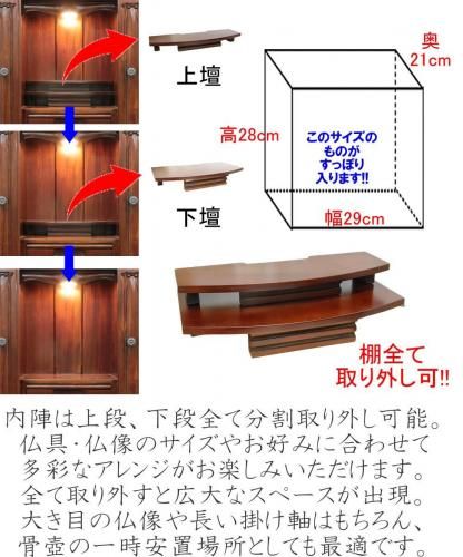 内陣壇は全て取り外しが可能。取り外すと大きなご本尊にも対応可能でお飾りの幅がぐんと広がります。外した内陣壇は前卓としてお供えものや仏具の安置にお使いいただけます。