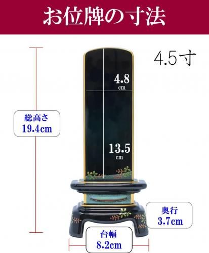 お位牌のサイズ 高19.4cm 幅8.2cm 奥3.7cm 戒名を入れる板の高さ 13.5cm ※サイズの詳細は商品画像をご参照ください。