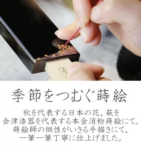 日本で古来より愛されている萩を会津漆器を代表する本金消粉蒔絵にて。蒔絵師の個性がいきる手描きにて、一筆一筆丁寧に仕上げました。